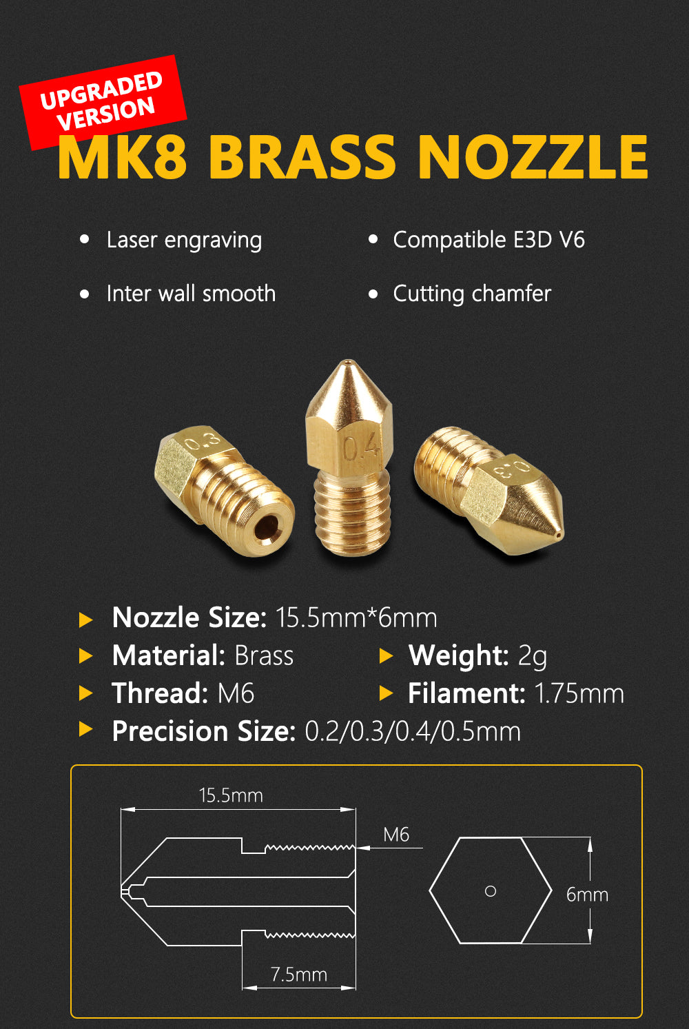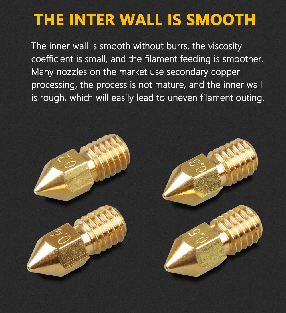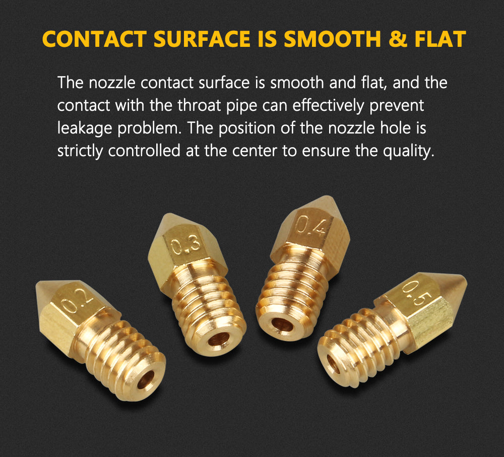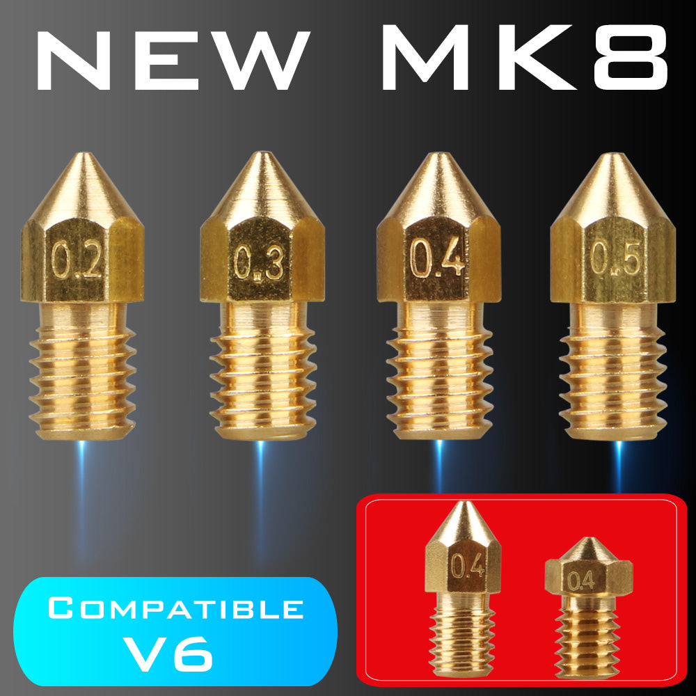 Produktbeschreibung: Da sich die Gewindelänge der MK8-Düse von der V6-Düse unterscheidet, gibt es Anforderungen an den Heizblock. Die MK8-Düse in Originalgröße erfordert, dass der Heizblock kürzer ist als das BP6- und NV6-Heizaaluminium. Dans Anbetracht dessen, dass einige Kunden lieber die MK8-Spitzendüse verwenden, hat unser Shop eine Düse mit der gleichen Gewindelänge wie die V6-Düse hergestellt, die mit der Verwendung von Heizblöcken wie V6 vollständig kompatibel sein kann.